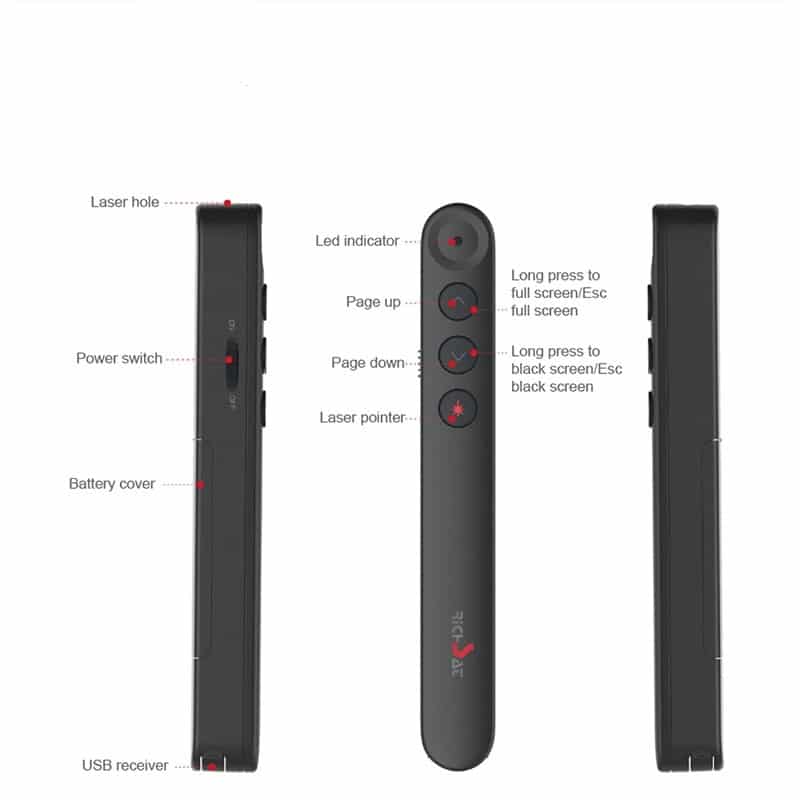 מעביר מצגות אלחוטי עם סמן לייזר הינו גאדג'ט קומפקטי (בעיצוב של עט) ונוח מאוד לשימוש וכולל 3 לחצני הפעלה: קדימה , אחורה, סמן לייזר אדום (פוינטר לייזר אדום לסימון ותצוגה שנראית למרחקים).