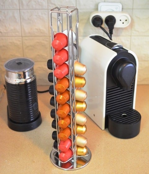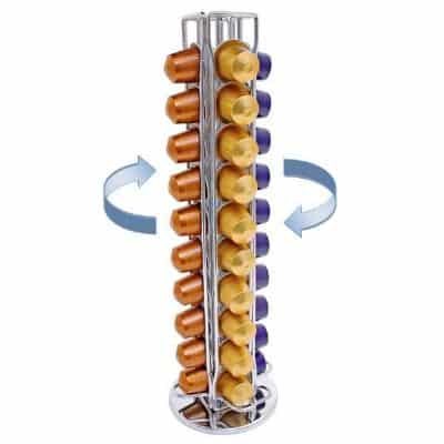 כאן בדיוק נכנס לתמונה ארגונית/מעמד מעוצב מסתובב המכיל מקום עבור 40 קפסולות של נספרסו.