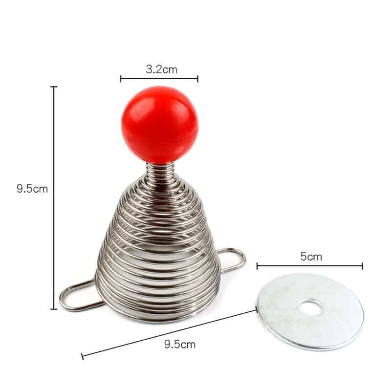 מה שנשאר זה להניח את האגוז על גבי התחתית, לאחוז בראש העגול (בצבע אדום) ולהניח את הקפיץ מעל האגוז, להצמיד באמצעות שתי אצבעות את הקפיץ לשולחן, עם היד השניה למשוך ולמתוח את הקפיץ ואז לשחרר…..קלאק !! קבלו פיצוח!