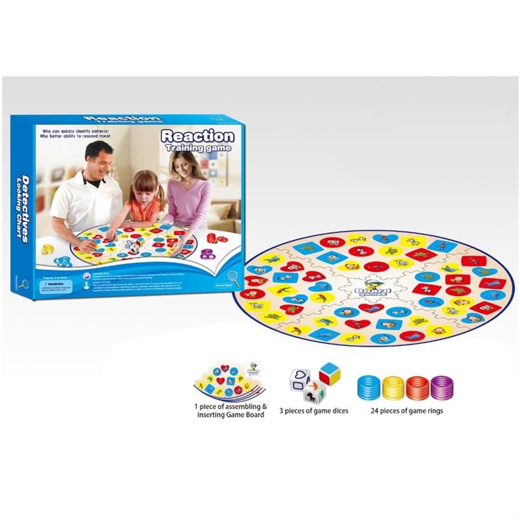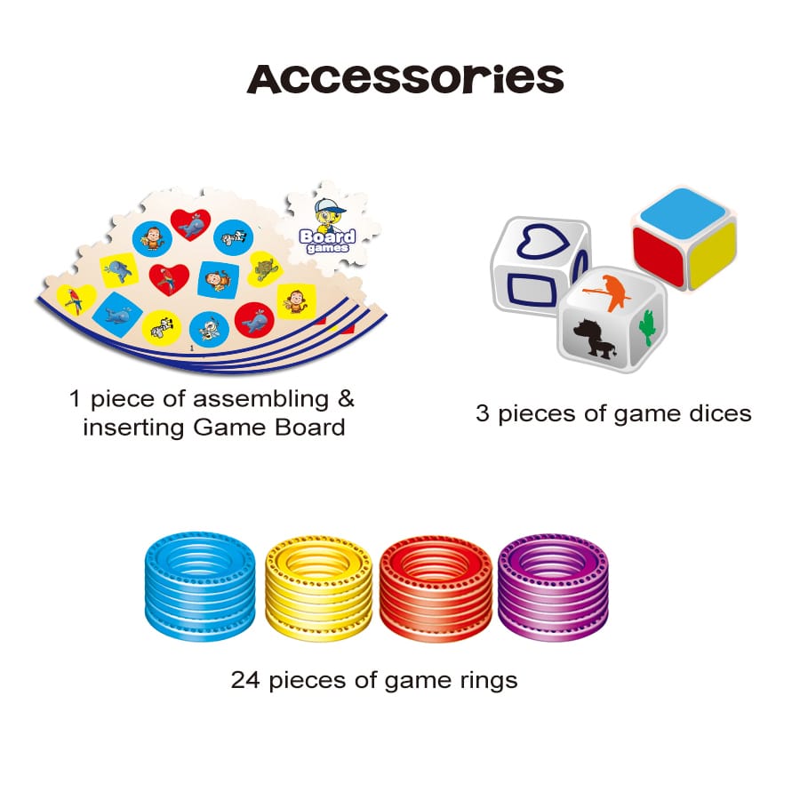 המשחק כולל: לוח עגול צבעוני מתפרק (לאחסון נוח) + 3 קוביות: צבע, אייקון, חיה + 24 טבעות ב-4 צבעים שונים.