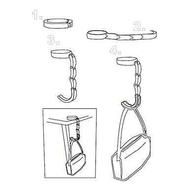 כל מה שאת צריכה לעשות פעם הבאה הוא לשלוף את המתלה האופנתי, לפתוח את המתלה סביב בסיס המתלה ולהצמיד בקלות לשולחן וזהו…. יש לך מקום אידאלי לתלות את התיק: לידך, במקום בטוח ונקי