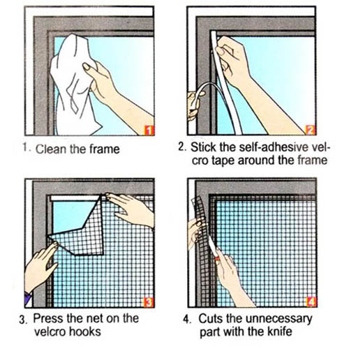 התקנה נוחה,פשוטה וקלה: מדביקים על מסגרת החלון את הפס דבק סקוטץ' זכר (המצורף לערכה) ומצמידים את הרשת בד אליה.